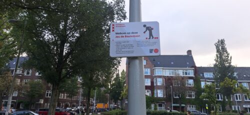 De baan ligt in het speelterrein Gerrit van der Veen straat tussen de twee scholen in. Helaas denken sommigen kinderen en hun ouders dat het een zandbak is. Inmiddels heb ik een hark gekocht en hoop daar verbetering in aan te brengen.